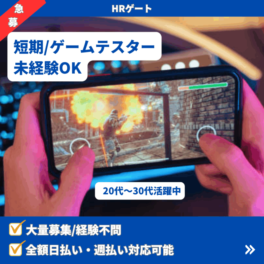 | 仕事内容 | 急募/短期/テスター業務 スマホやゲーム機で動作確認を行い、 不具合が見つかった際に専用のフォーマットへ入力頂くお仕事です! 【開始日】1月15日(木) 【期 間】短期1ヶ月(1月15日~02月20日まで) ※延長の可能性あり 【時 間】下記時間シフト(基本全時間対応) 09:00~20:00の間で実働8時間シフト ①10:00~19:00 ②10:00~19:15 ③09:30~18:30 ④09:45~19:00 ⑤11:00~20:00 ⑥09:30~18:15 ⑦09:15~17:15 ⑧09:00~18:15 ⑨10:30~19:30 ⑩09:45~18:30 休憩時間:60分 【勤務日】平日5日(月曜~金曜) 【休 日】土日祝 【給 与】1,250円/時(交通費込み) 【勤務地】東京都渋谷区代々木 【最寄駅】新宿駅より徒歩5分 ※人数に達する前に募集を終了する可能性もございます。 |